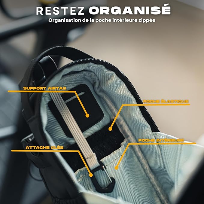 Keep your essentials perfectly organized and within reach with its spacious zippered compartment. Designed for optimal organization, it features a large internal pocket and a key hook for maximum convenience.